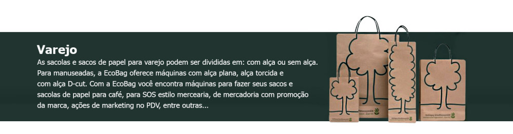 Sacolas e Sacos em Alta VelocidadeEcoBag Roll são máquinas alimentadas por bobinas para produção de sacos e sacolas de papel. Utilizadas em aplicações empresariais de produção ecológicas, principalmente em embalagens para alimentos e compras no varejo, e também nos setores farmacêutico e industrial, as máquinas EcoBag Roll são amigas da natureza na busca de um mundo mais sustentável.