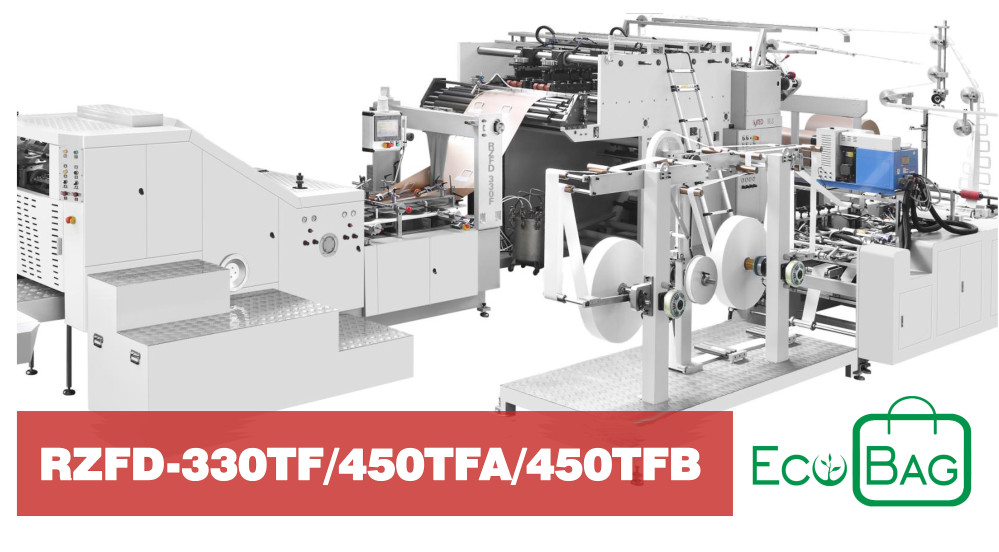 A EcoBag RZFD-330TF / 450TFA / 450TFB são projetadas para fabricar sacos e sacolas de papel de fundo quadrado com alças planas e torcidas. Totalmente automáticas, desde o carregamento do rolo de papel, fabricação e aplicação da alça plana até a formação do tubo, corte do tubo, formação do fundo e entrega final do saco. Adequadas para fabricação em massa de uma gama completa de tamanhos de sacos e sacolas de papel para indústrias como de alimentos e roupas. O processo de uma linha consiste na fabricação de alças torcidas a partir de rolos de papel e corda torcida, entrega das alças à unidade de colar, pré-corte do papel na posição da corda, colagem da posição do remendo, colagem da alça e confecção do saco de papel. O processo de fabricação do saco de papel consiste na colagem lateral, formação do tubo, corte, vinco, colagem do fundo, formação do fundo e entrega do saco. Estas máquinas possuem controlador de movimento de alta velocidade (CPU), que controla a operação do servo por meio de barramento rápido para garantir movimentos estáveis e suaves.