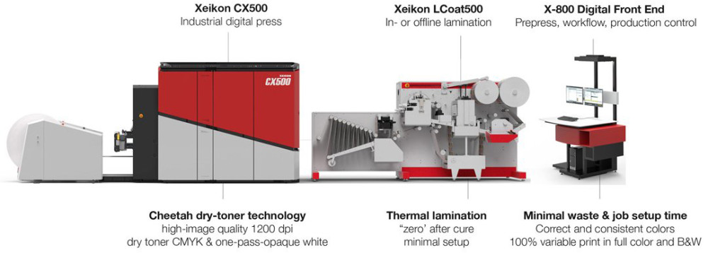 As novas impressoras digitais Xeikon CX para rótulos, etiquetas, in mold label, heat transfer, pouches, papel de paredes, documentos entre outras aplicações, são baseadas em uma plataforma de toner seco de última geração, pronta para a Indústria 4.0. Para impressos de tamanhos grandes, que exijam uma gama de cores opaca ou branca opaca, as Xeikon CX300 e CX500 superam todas as impressoras digitais de alta qualidade em termos de produtividade, graças à sua largura de banda de até 520 mm (20,47 " – CX500), tecnologia de impressão rotativa completa e velocidade de impressão de até 30 m / min (98 pés / min) A Xeikon CX500 de banda larga faz parte da série Cheetah de toner seco Xeikon, que atende ao mercado de rótulos e etiquetas autoadesivas de alta qualidade, e complementa a Xeikon CX300 de banda estreita.