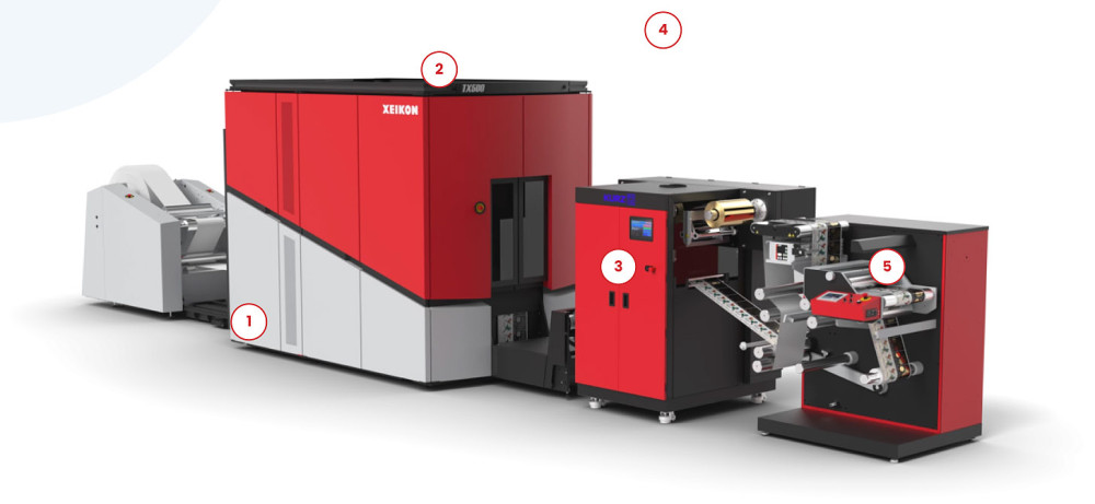 A impressora digital Xeikon TX500 possui uma unidade LED-UV integrada para reticulação do toner TITON, o que acontece depois que a imagem em pó for transferida para o substrato à base de papel e os componentes do toner forem fundidos ao material de impressão a uma temperatura de aproximadamente de 100°C.